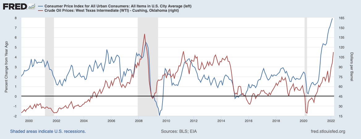 Динамика котировок нефти марки WTI (красная линия; правая ось; USD) и индекса потребительских цен в США (синяя линия; левая ось; г/г, %) за период с 1999–2022 гг. Дата обращения: 30 марта 2022 г. Источник: fred.stlouisfed.org.