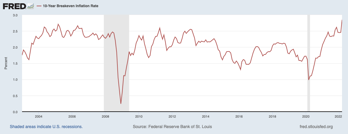 Динамика 10-летней прогнозной инфляции (г/г, %) за период с 2003–2022 гг. Дата обращения: 30 марта 2022 г. Источник: fred.stlouisfed.org.