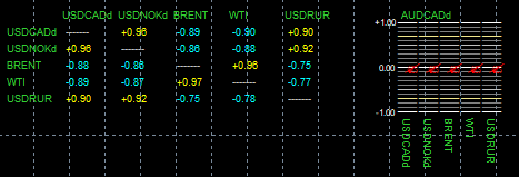 На рисунке также представлена высокая отрицательная корреляция между изменением цен нефти и динамикой котировок следующих валютных пар: USD/CAD, USD/RUB и USD/NOK. Она показывает, что рост нефти сопровождается снижением котировок соответствующих торговых инструментов, и наоборот. Отслеживайте актуальные торговые идеи в Telegram, чтобы всегда быть в курсе рыночных тенденций!