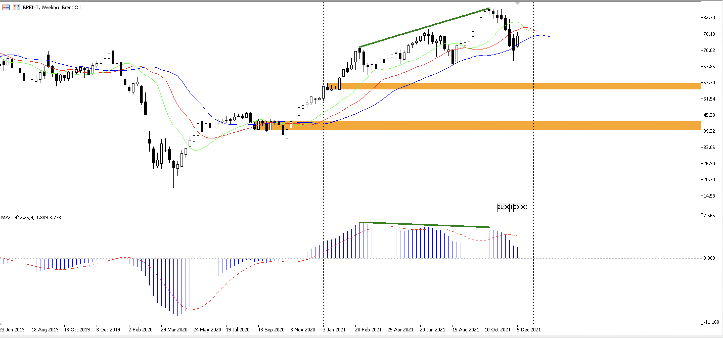 На рисунке выше представлен вариант графического и технического анализа динамики нефти Brent на 2022 год с использованием индикаторов Alligator (13, 8, 5) и MACD (12, 26, 9).