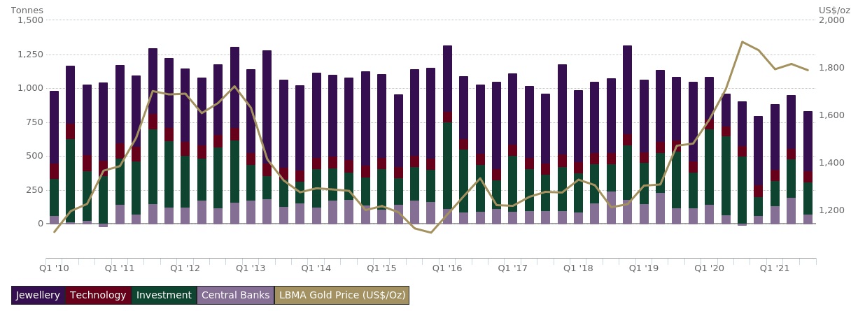 Динамика спроса на золото за период с 2010–2021 гг. Данные представлены по расчетам на 31 сентября 2021 г. Дата обращения: 20 декабря 2021 г. Источник: gold.org.