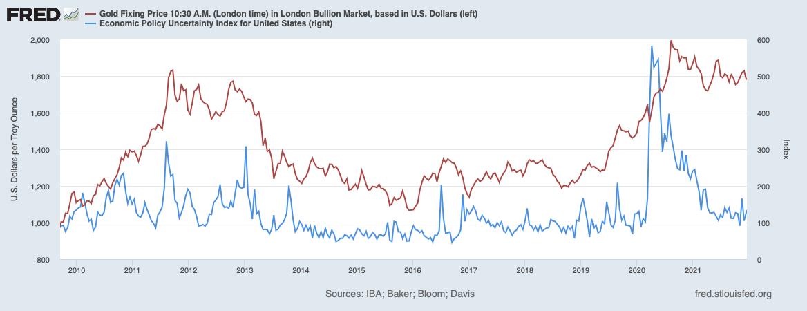Выше на рисунке продемонстрирована динамика между индексом неопределенности экономической политики в США и ценой на золото. Золото в периоды кризисов и высокой неопределенности играет роль защитного актива. Поэтому при росте неопределенности цены на котировки Gold растут.