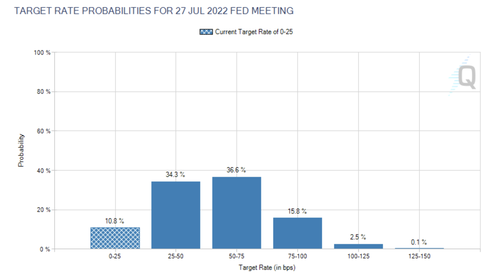 Распределение вероятностей изменения ключевой ставки процента в США на заседании ФРС 27 июля 2022 г. Дата обращения: 20 декабря 2021 г. Источник: cmegroup.com.