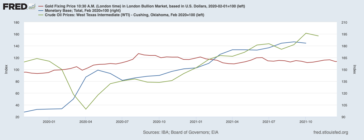Динамика котировок золота XAU/USD (красная линия; левая ось), нефти марки WTI (зеленая линия; левая ось) и денежной базы США (синяя линия; правая ось) за период с 2019–2021 гг. Значения оформлены в форме индекса, где за 100 пунктов принимается значение от 01.02.2020. Дата обращения: 20 декабря 2021 г. Источник: http://fred.stlouisfed.org/.
