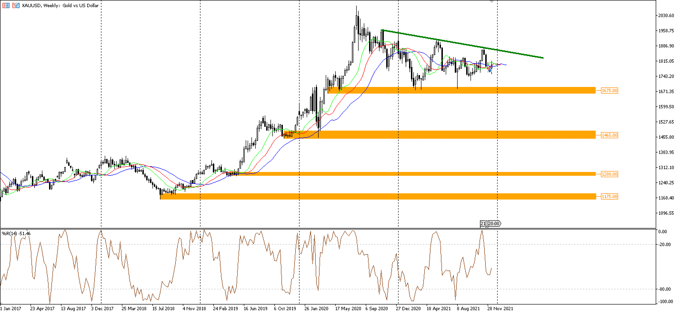 Зеленой линий показана локальная нисходящая тенденция – за последние полтора года котировки XAU USD не обновляли локальные ценовые максимумы.
