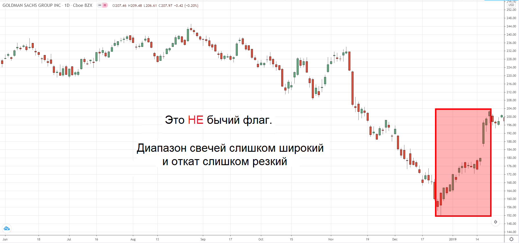 Здесь важны детали — как именно ведет себя цена. Небольшой откат, состоящий из «свечей» меньшего диапазона — это точно «флаг». Резкий откат с внушительным диапазоном «свечей» — это уже не паттерн «бычий флаг», а нечто ближе к коррекции.