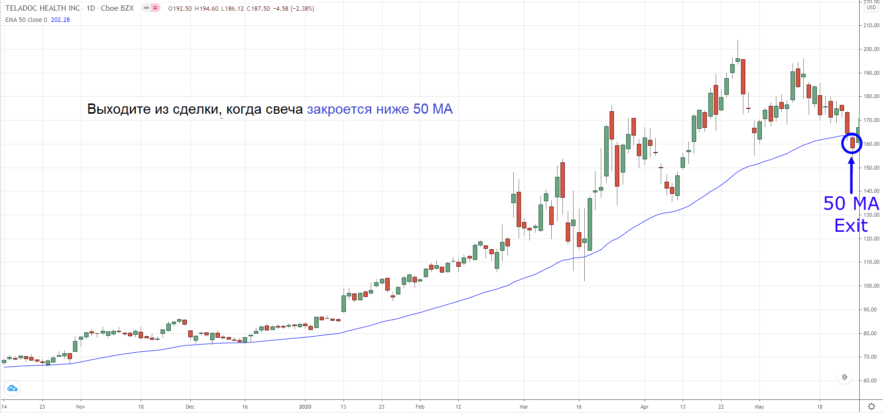 Как это сделать? Можно, например, использовать такой инструмент, как 50-дневная «скользящая средняя», чтобы мониторить стоп-лосс и выходить из сделки только тогда, когда рынок закрывается выше стопа.