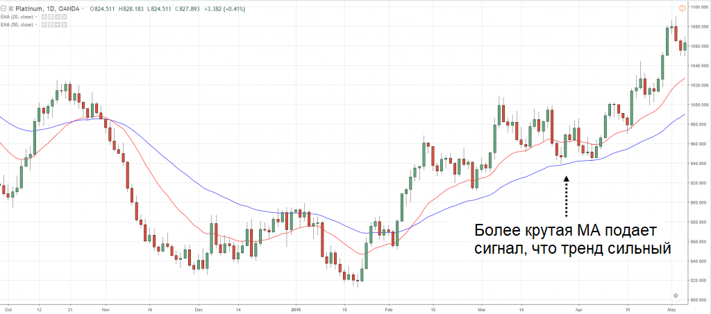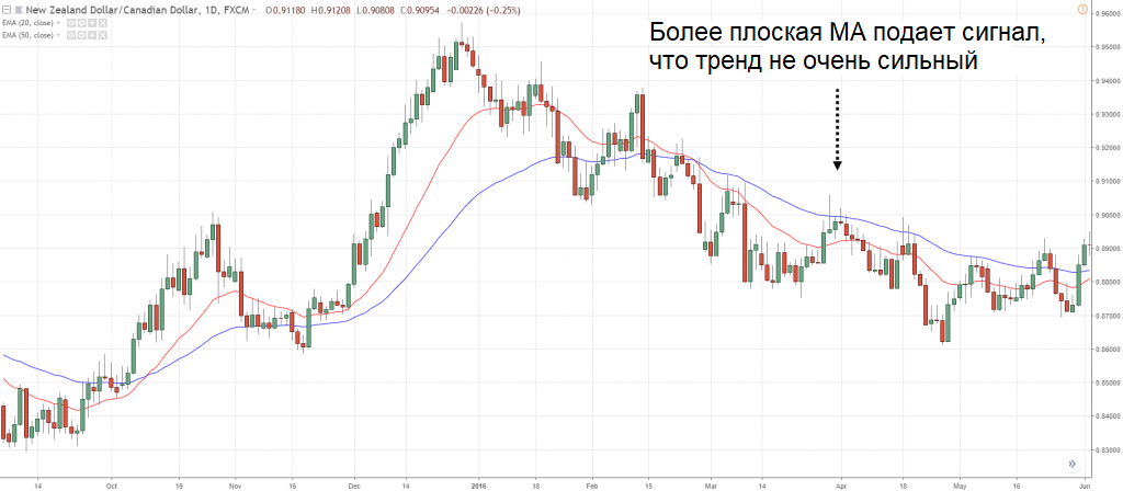 Вы можете оценивать мощь (потенциал) тренда, посмотрев на крутизну линии МА.