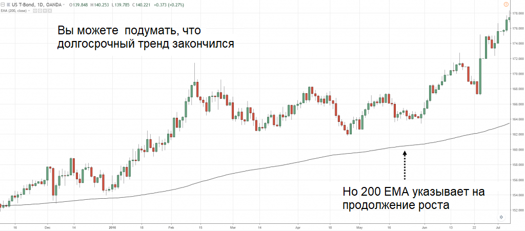 Скажем, краткосрочная MA (например, 5 EMA) создает возможности на коротком тренде. Долгосрочная МА (например, 200МА) даст шанс заработать на длинных отрезках.