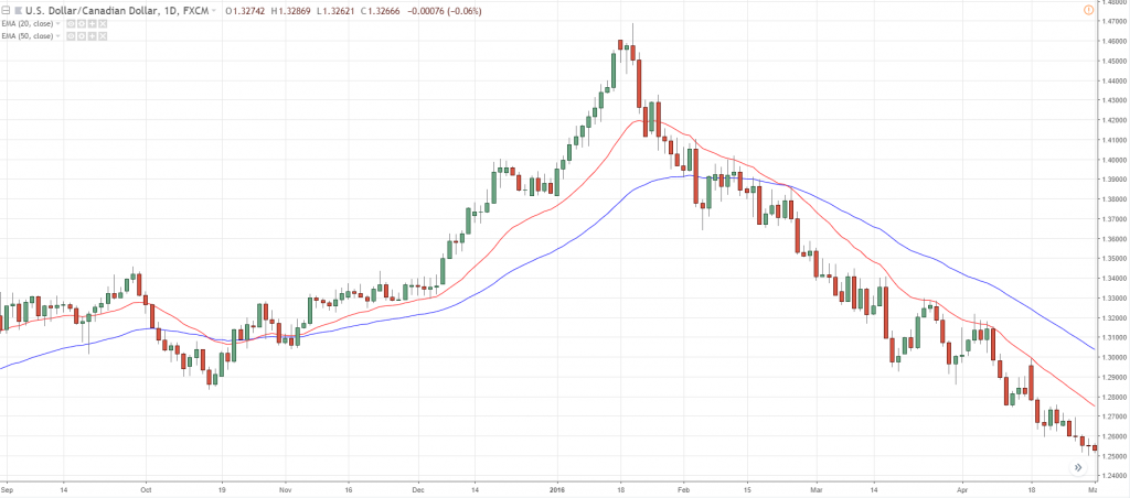 Для USD/CAD скользящие средние линии в моменте крутые и явно направлены вниз.