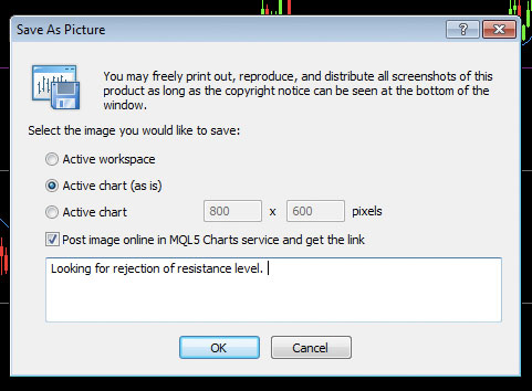 Можно добавить примечания к графику в текстовое поле. После нажатия OK график будет автоматически опубликован в вашей учетной записи MQL5.