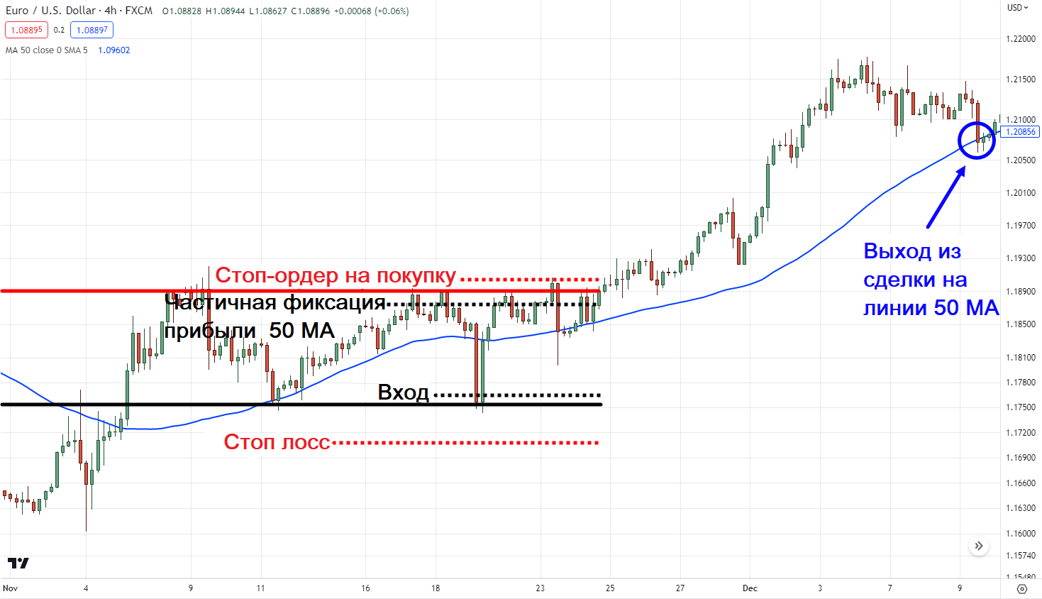 - Отслеживайте стоп-лосс, используя среднесрочную скользящую среднюю.