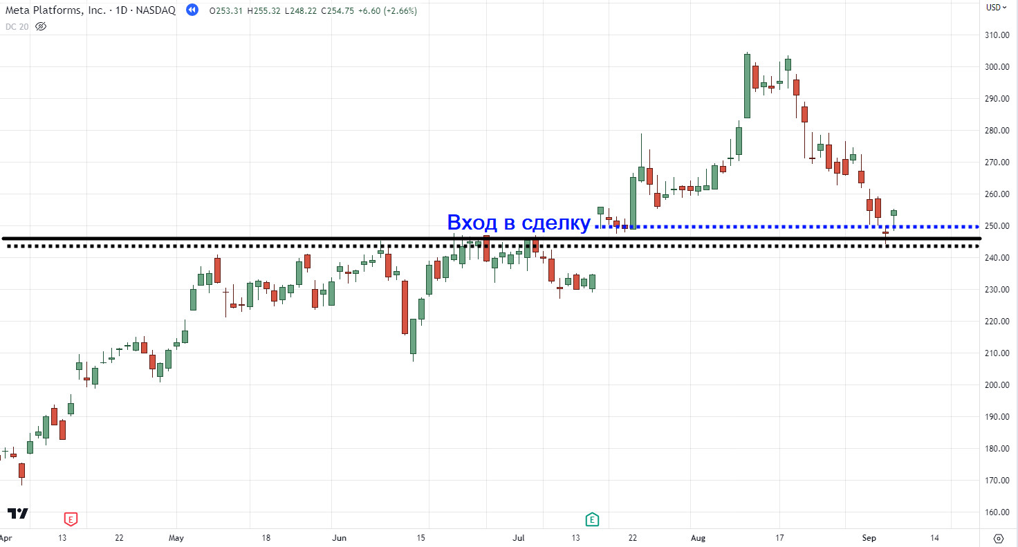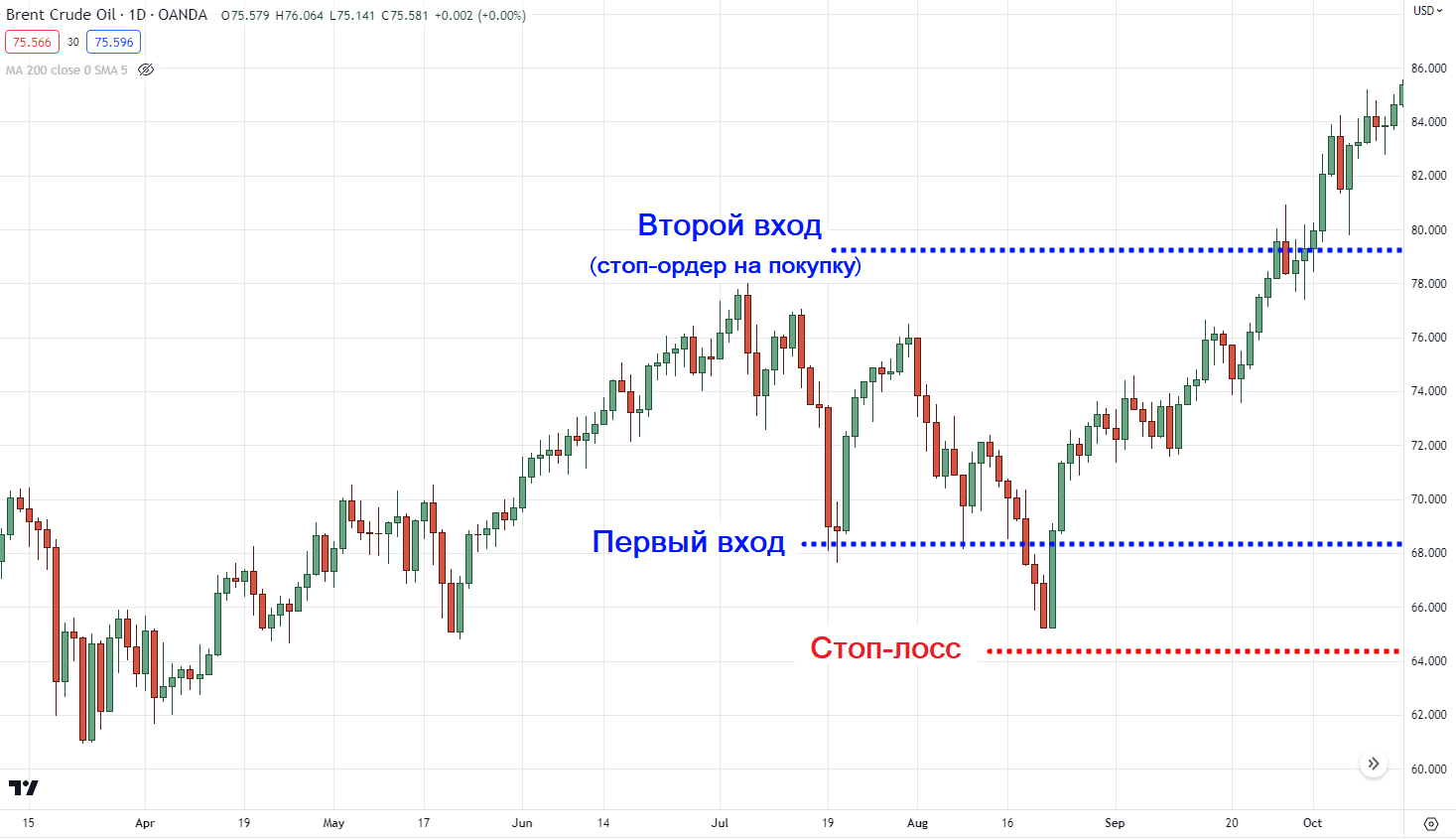 Вы размещаете лимитный ордер ниже рыночной цены, чтобы зайти в рынок по более выгодной цене (для коротких позиций — наоборот).