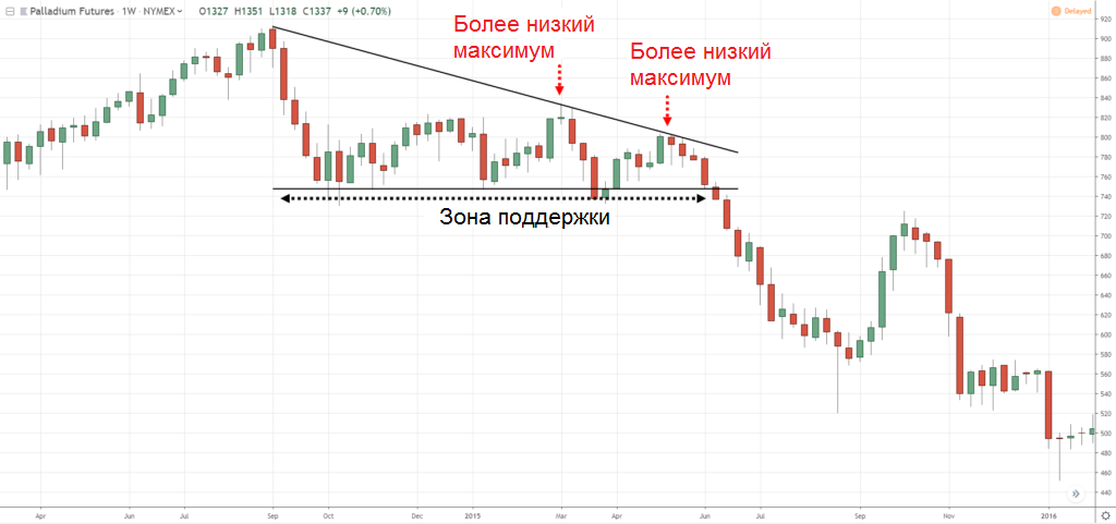 Нисходящий треугольник визуально — это ряд более низких ценовых максимумов, входящих в область поддержки. «Медвежья» фигура на графике символизирует ситуацию, которая полностью управляется продающими трейдерами.